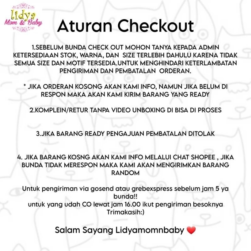 ATURAN ORDER : 1.SEBELUM BUNDA CHECK OUT MOHON TANYA KEPADA ADMIN KETERSEDIAAN STOK,WARNA,DAN SIZE TERLEBIH DAHULU KARENA TIDAK SEMUA SIZE DAN MOTIF TERSEDIA.UNTUK MENGHINDARI KETERLAMBATAN PENGIRIMAN DAN PEMBATALAN ORDERAN. 2.KOMPLEIN/RETUR TANPA VIDEO UNBOXING DI BISA DI PROSES 3.JIKA BARANG READY PENGAJUAN PEMBATALAN DITOLAK 4. JIKA BARANG KOSNG AKAN KAMI INFO MELALUI CHAT SHOPEE , JIKA BUNDA TIDAK MERESPON MAKA KAMI AKAN MENGIRIMKAN BARANG RANDOM