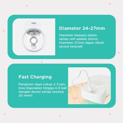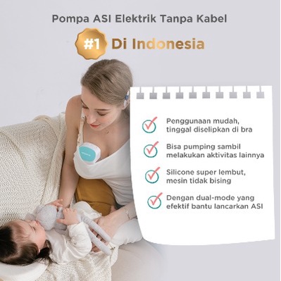 Pompa ASI Elektrik TANPA kabel (wireless) - Dapat memompa ASI tanpa menggagu aktivitas penting mom lainnya (hands-free) - Bahan silikon food grade yang aman untuk ASI - Desain yang lebar, besar, dan luas. Memudahkan proses memompa ASI - Terdapat 25 mode pilihan yang dapat disesuaikan dengan tingkat sensitivitas payudara yang berbeda - Memiliki dua mode; 1) Mode menyusui, 2) Mode pompa - Pijatan yang efisien pada payudara dapat membantu menghasilkan ASI dalam waktu yang lebih singkat - Tahap stimulasi ASI yang cepat, 70-70 siklus per menit, merangsang ASI keluar lebih lancar (let down reflex) - Tahap pemompaan ASI lambat, 30-60 siklus per menit, untuk memerah ASI dengan nyaman dan santai - Menutupi payudara hingga 360 derajat, cocok untuk berbagai bentuk payudara, serta memperlancar pengeluaran ASI - Lembut dan ramah di kulit payudara - Mesin bekerja dengan frekuensi suara yang rendah, Anda tidak perlu khawatir akan membangunkan si Kecil saat memompa ASI di malam hari - Memiliki mode pengingat otomatis - Ringan dan mudah dibawa - Pengisian daya selama 2-3 jam, setelah itu dapat digunakan 4-6 kali dengan durasi setiap sesi 20 menit untuk memompa ASI - Mudah merakit dan membongkar untuk dibersihkan