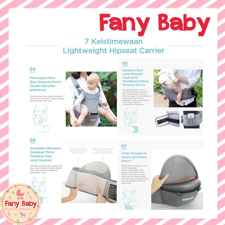 Hipseat carrier Cushion seat didesain ergonomis Untuk usia 3-36 bulan Mampu menahan berat bayi hingga 20kg Dilengkapi tali bahu, ikat pinggang dan ritsleting panel yang mudah digunakan