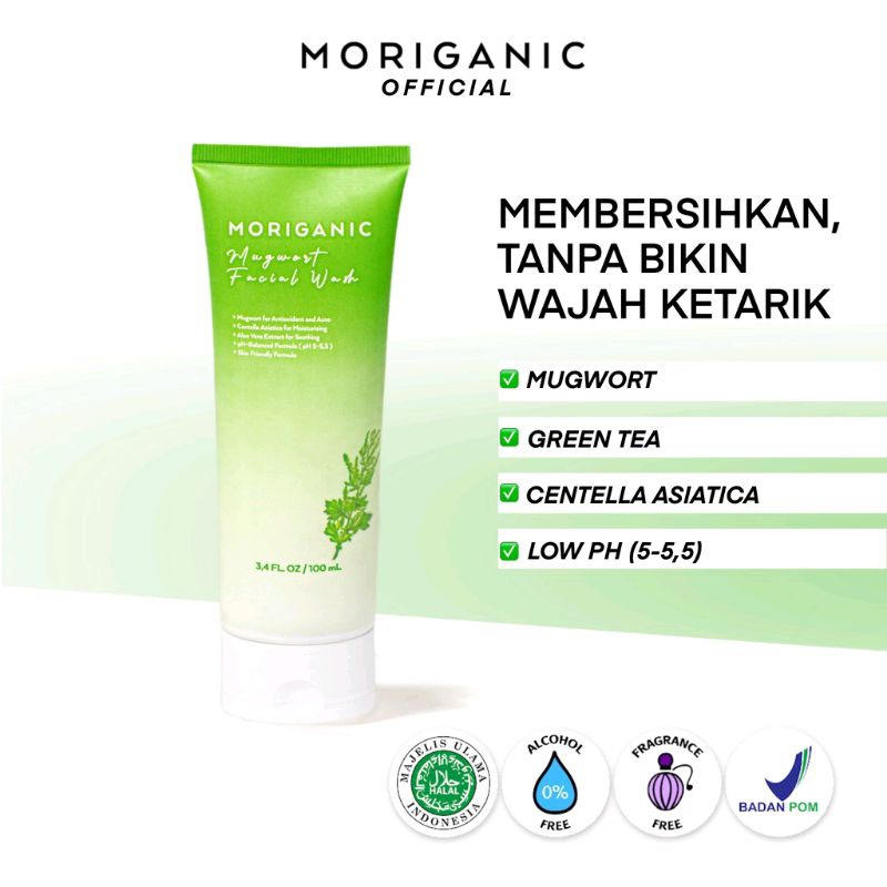 Moriganic Mugwort Facial Wash merupakan pembersih wajah yang diformulasikan sesuai dengan PH alami kulit (5-5.5) dan bahan yang sangat gentle, NO SLS dan NO PARABEN. Facial wash ini dapat membersihkan kulit tanpa membuat kulit kering, tertarik dan merusak barrier kulit.