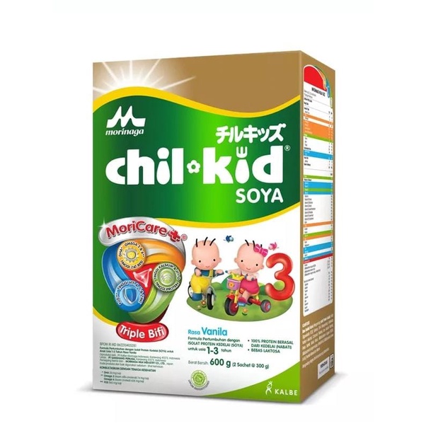 Morinaga Chil Kid Formula Soya, Susu formula pertumbuhan untuk anak usia 1-3 tahun, Satu-satunya Formula Pertumbuhan Tinggi Protein Soya dilengkapi dengan Sinbiotik (Sinergi Kombinasi Probiotik Triple Bifidus + Prebiotik Serat FOS).