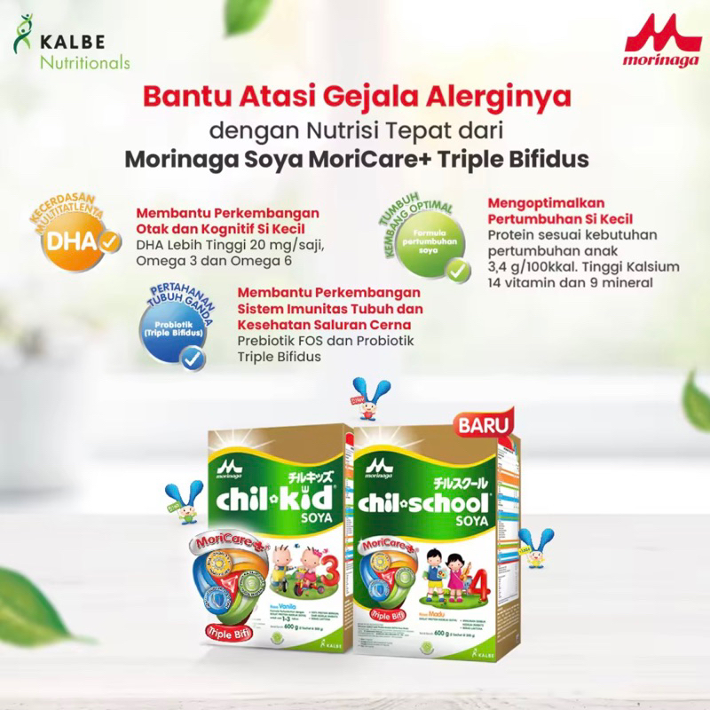 Morinaga Chil Kid Soya merupakan susu anak usia 1-3 tahun dengan Isolat Protein Kedelai (sebagai sumber protein) yang berkualitas tinggi setara susu sapi (ditambahkan L-metionin dan karnitin). Cocok untuk anak yang memiliki alergi susu sapi / Intoleransi Laktosa / menderita Galaktosemia. Dengan Formula Moricare+ Prodiges susu anak ini memiliki sinergi nutrisi tepat dari Faktor Kecerdasan Multi talenta, Faktor Pertahanan Tubuh Ganda dan Faktor Tumbuh Kembang Optimal.