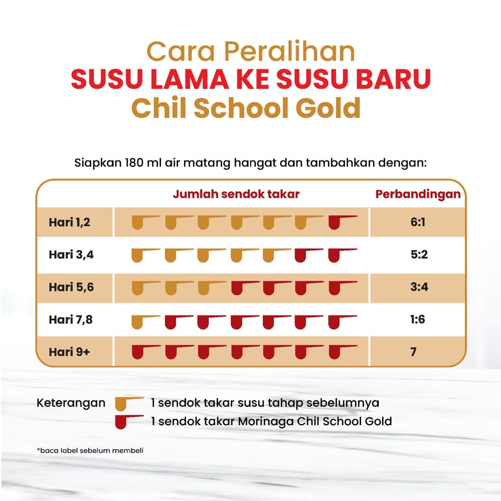 Morinaga Chil School Gold susu pertumbuhan untuk Si Kecil di usia 3 tahun ke atas dengan inovasi unggulan berupa sinergi nutrisi untuk mendukung Kecerdasan Multitalenta dan Pertahanan Tubuh Ganda serta memiliki Formula yang Disempurnakan untuk dukung Si Kecil meraih mimpi besarnya sejak dini karena #WaktuTakBisaKembali.