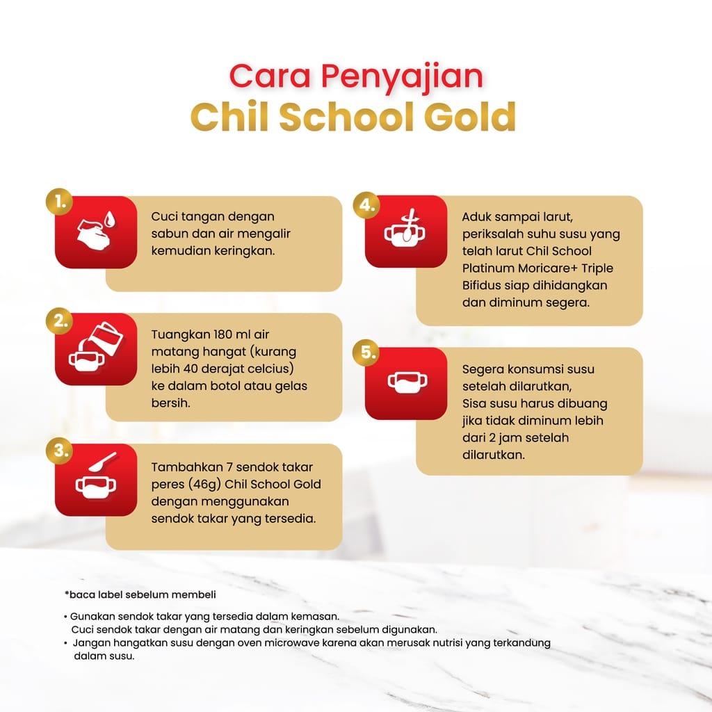 • Aduk sampai larut, periksalah suhu susu yang telah larut Chil School Platinum MoriCare+ Triple Bifidus siap dihidangkan dan diminum segera.