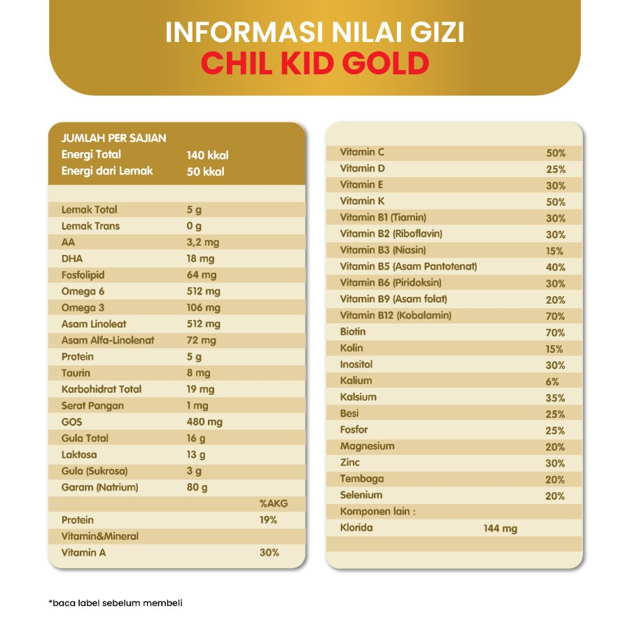 Morinaga Chil Kid Gold merupakan susu pertumbuhan anak usia 1-3 tahun untuk mendukung tumbuh kembang Si Kecil yang optimal. Mengandung sinergi nutrisi tepat Brain Care dan Body Defense yang menunjang Faktor Kecerdasan Multitalenta untuk mempercepat daya tangkap dan daya ingat Si Kecil. Serta Faktor Pertahanan Tubuh Ganda yang melindungi saluran cerna dan meningkatkan daya tahan tubuh Si Kecil agar ia tidak mudah demam, batuk, pilek, diare, dan sembelit.