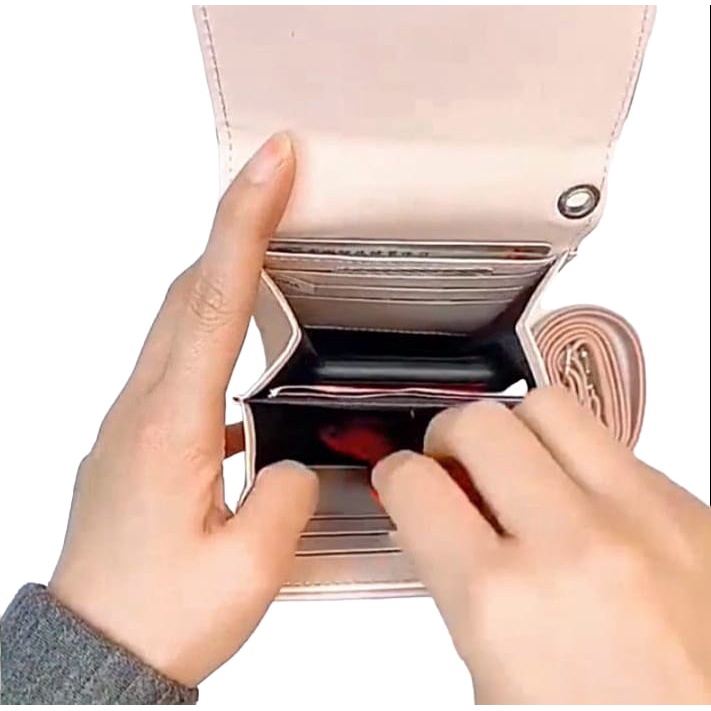 Produk terdiri dari : - Terdapat 4 slot penyimpanan kartu - Tersedia 2 ruang hp - Terdapat tali panjang