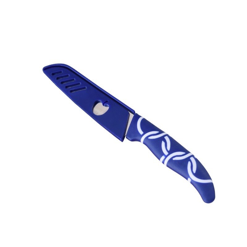 Pisau pengupas buah dari bahan stainless steel yang tajam dengan gagang dan sarung yang berwarna-warni ceria.