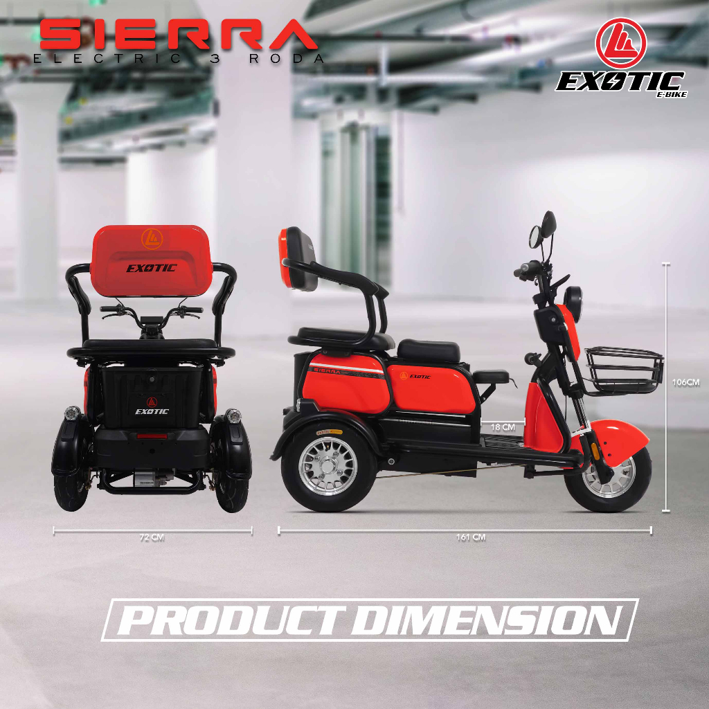Product Specification : Model : Exotic Sierra Motor power : 800w Voltage : 48v Battery : 48v20.2ah SLA Tire Size : Tubles R10 Jarak Tempuh : 55km/h Riding Mode : 3 Speed (ECO, NORMAL, SPORT) Max Speed : 30km/h Charging time : 5-6h Max loading : 180kg