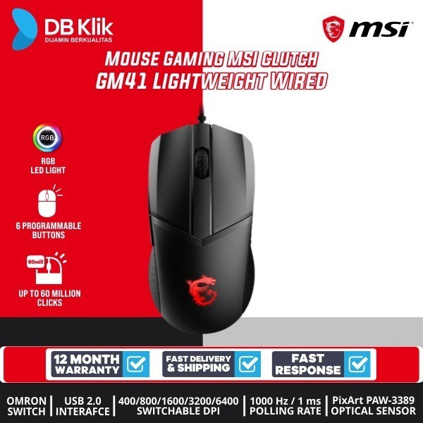 SPECIFICATIONS MODEL NAME CLUTCH GM41 LIGHTWEIGHT INTERFACE USB 2.0 LED LIGHT RGB POLLING RATE 1000 Hz / 1 ms SENSOR PixArt PMW-3389 Optical Sensor MAX DPI 16000 (Software) PRESET SWITCHABLE DPI 400 / 800 / 1600 / 3200 / 6400 SWITCH TYPE OMRON SWITCH DURABILITY 60 Million Clicks NUMBER OF BUTTONS 6 Programmable Buttons OPERATING SYSTEM Windows 10 (and above) CABLE TYPE MSI FriXionFree CABLE LENGTH 2m PRODUCT DIMENSIONS (MM) 130.1 x 67 x 38.3 mm WEIGHT (PRODUCT / PACKAGE) 65g (without cable) / 186g