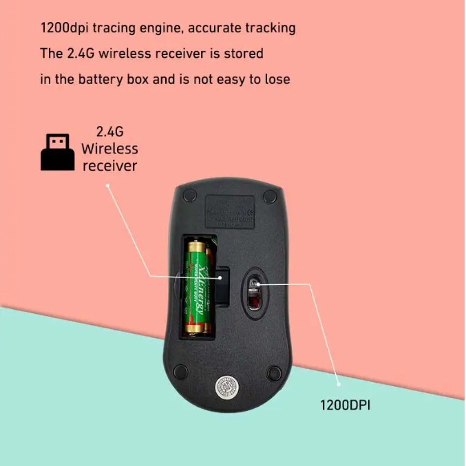 Wireless Mouse Features : * NO On/Off, Sleep Mode Save battery life * Ergonomic Design, fit for both hands * Small nano size receiver - Set it and forget it * Buttons last millions of clicks for durability * Powered by 1 x AA Battery * 1200 DPI for suitable daily usage * With 10M workable range * Power Saving with function of Auto Sleep * Applications : Computer / Laptop / Desktop / Notebook
