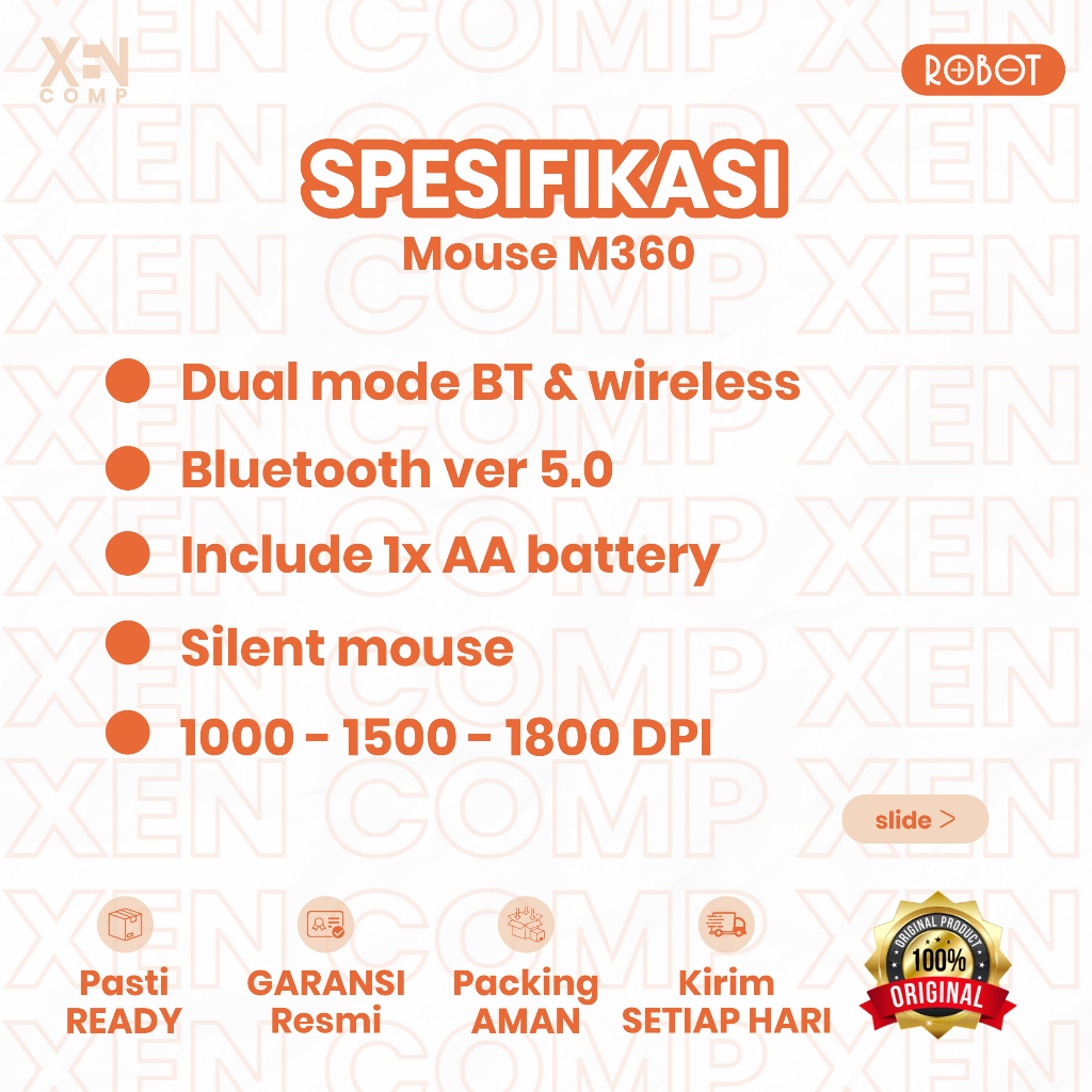 Keunggulan: 1. Dual Mode, bisa menggunakan bluetooth (5.0) dan USB receiver 2.4G 2. Dapat digunakan pada 2 berangkat yang berbeda 3. Bisa untuk komputer, notebook, tablet atau ponsel 4. Dapat digunakan untuk Windows10/MacOS/iOS/android dan lainnya 5. Silent Button, tidak berisik dan tidak mengganggu saat digunakan 6. 3 gear adjustable DPI , menyesuaikan posisi kursor agar lebih akurat dengan 3-kecepatan (1000-1500-1800) 7. Terdapat tombol on/off