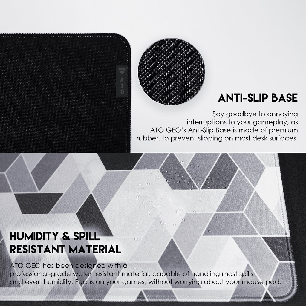 Bahan Dasar Anti Slip Mulai sekarang kamu bisa ucapkan selamat tinggal kepada semua distraksi yang mengganggu selama bermain game. ATO GEO dirancang dengan base anti slip sehingga kamu bisa fokus pada permainan tanpa terganggu oleh deskmat yang bergeser dengan sendirinya.
