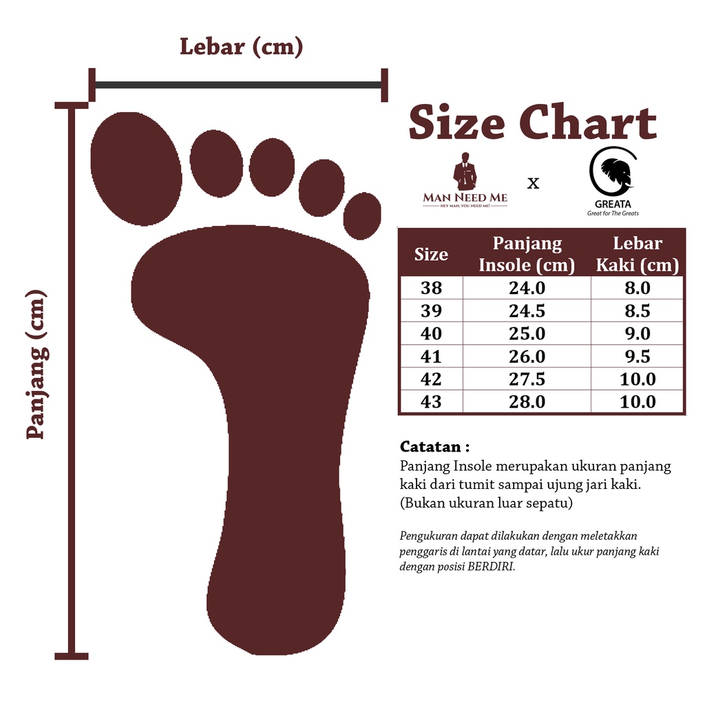 Size Chart (Panjang Kaki = PK, Lebar Kaki = LK) Size 38 = PK : 24,0 cm / LK : 8.0 cm Size 39 = PK : 24,5 cm / LK : 8.5 cm Size 40 = PK : 25,0 cm / LK : 9,0 cm Size 41 = PK : 26,0 cm / LK : 9,5 cm Size 42 = PK : 27,5 cm / LK : 10,0 cm Size 43 = PK : 28,0 cm / LK : 10,0 cm (Untuk cara Pengukuran, silakan lihat di panduan ukuran)