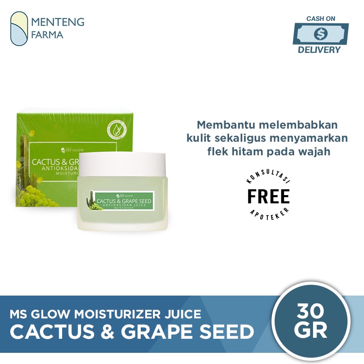 Khasiat dan Kegunaan Ms Glow Cactus & Grape Seed Antioksidant Juice Moisturizer : - Membantu melembabkan kulit - Sebagai antioksidan untuk menjaga kesehatan kulit - Mengurangi iritasi pada kulit (Calming) akibat paparan sinar matahari - Membantu memudarkan noda hitam dan flek - Membantu mencegah timbulnya flek hitam