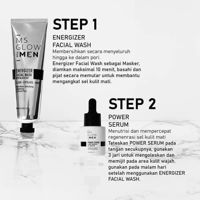 Ms glow men basic (3in1) - Energize facial wash 100ml - Power serum wajah 20ml - Energy bright cream wajah 30ml * Free travel pouch ekslusif
