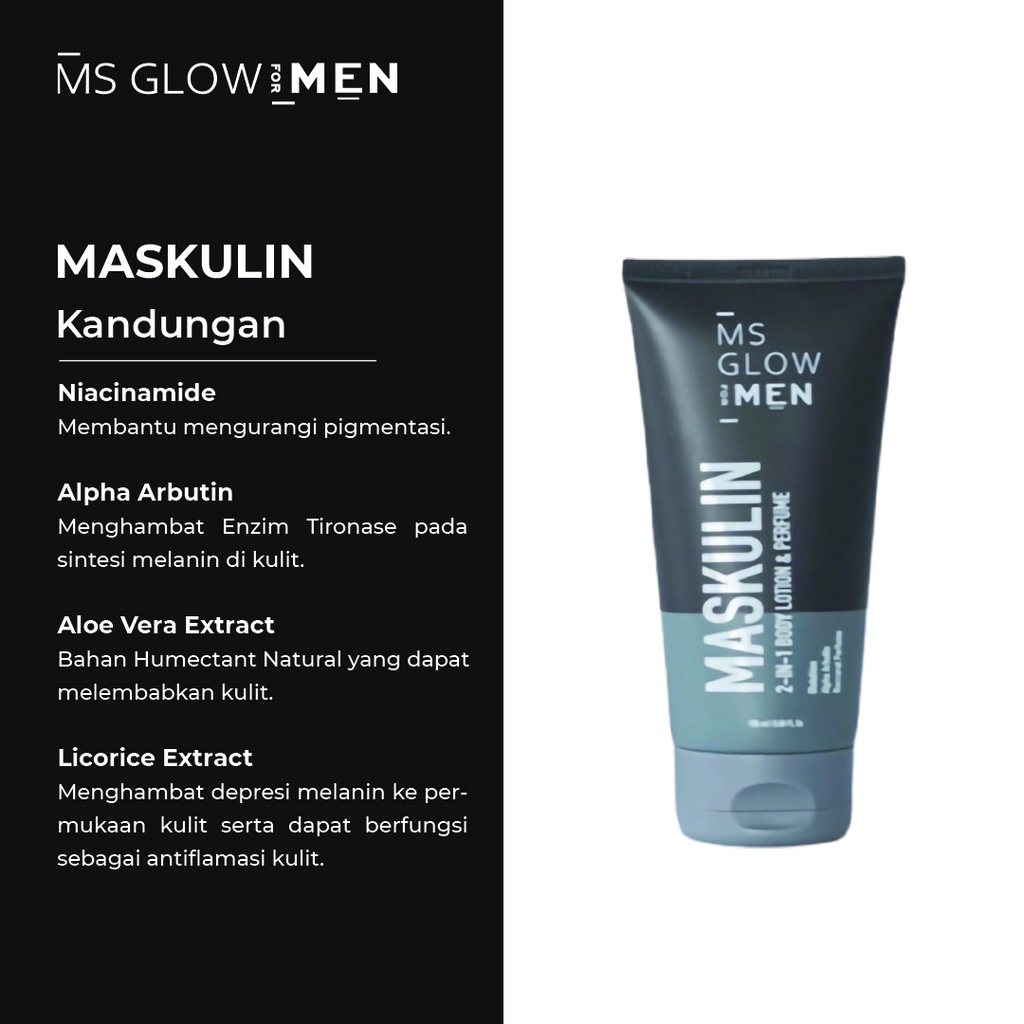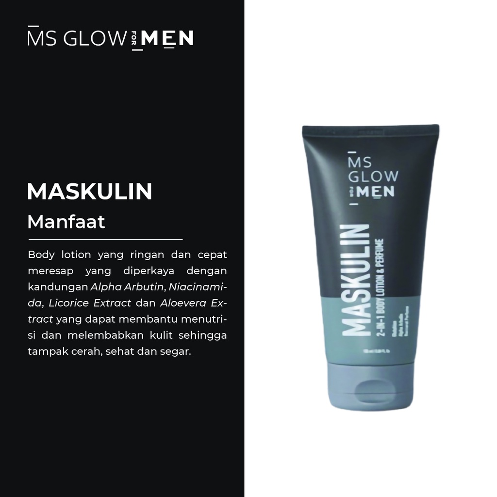 Maskulin 2in1 Body Lotion & Parfume dari Ms Glow For Men ini juga bisa dijadikan parfum karna mengandung Baccarat Parfume yang wangi nya itu cowok banget bikin MsBro makin pede setiap menjalani aktifitas.