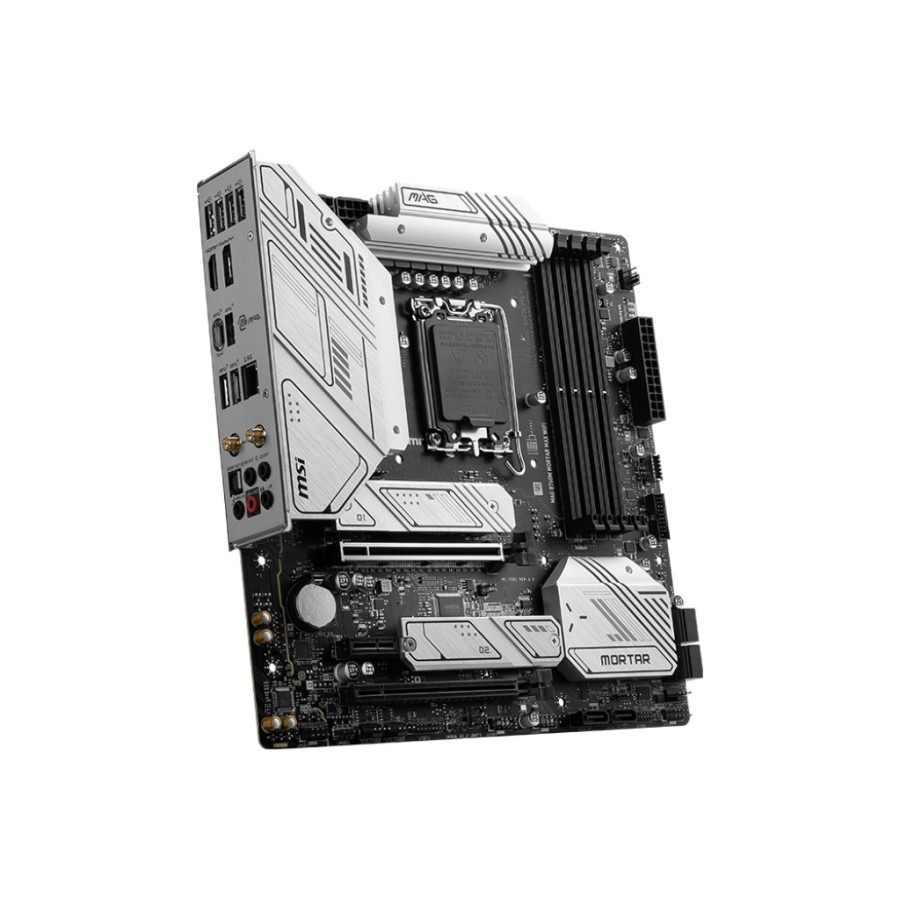 SPECIFICATIONS Model Name : MAG B760M MORTAR MAX WIFI CPU Support : Supports 12th/ 13th Gen Intel Core Processors, Pentium Gold and Celeron Processors CPU Socket : LGA 1700 Chipset : Intel B760 Chipset Expansion Slots : 1x PCIe 5.0 x16 slot, 1x PCIe 4.0 x16 slot, 1x PCIe 3.0 x1 slot Memory Support : 4 DIMMs, Dual Channel DDR5-7000+ (OC) LAN : Realtek RTL8125BG 2.5Gbps LAN Wireless / Bluetooth : Intel Wi-Fi 6E, Bluetooth 5.3 Audio : 8-Channel (7.1) HD Audio with Audio Boost