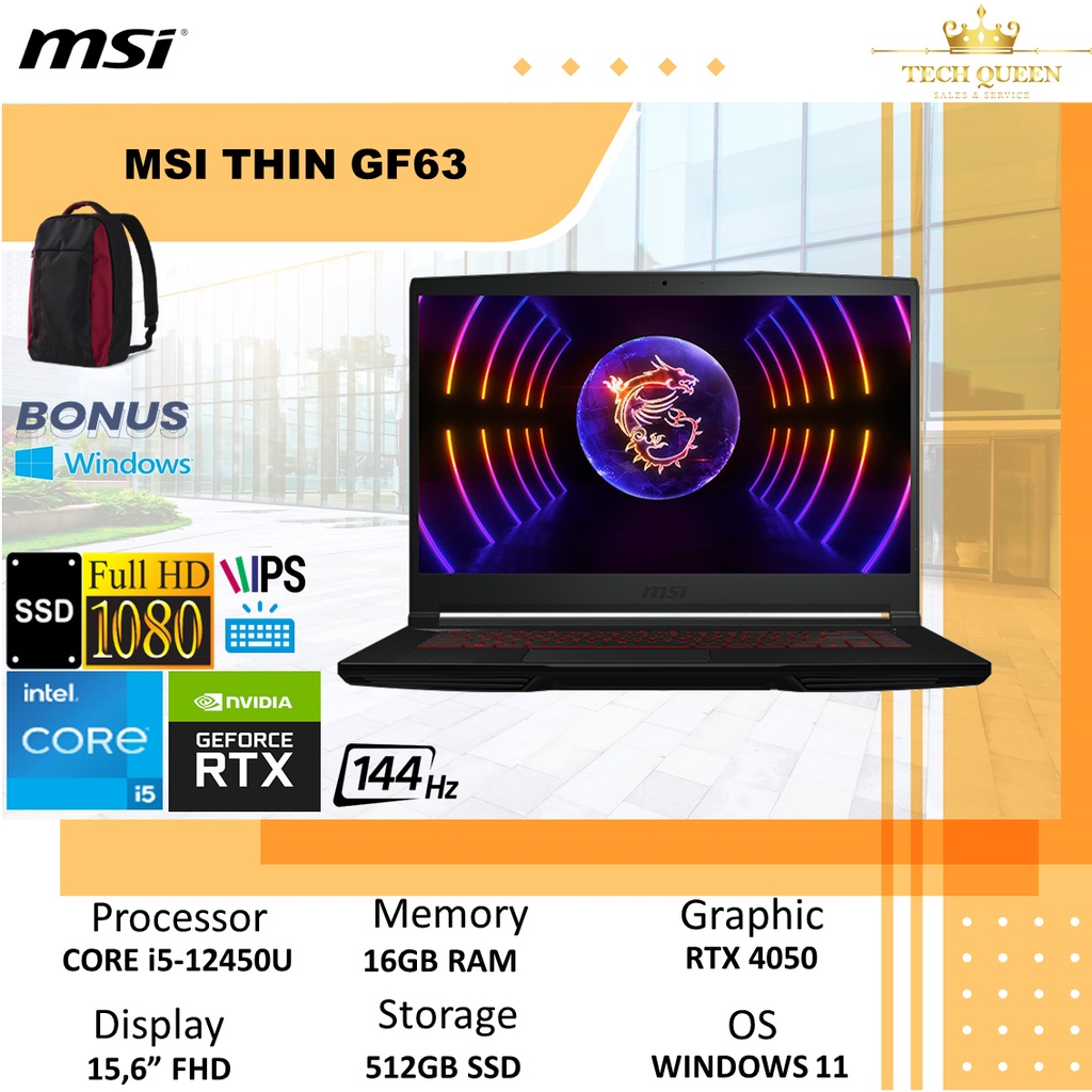 Detail MSI THIN GF63 - RTX4050 6GB I5 12450H 16GB 512SSD WINDOWS 11 15.6 INCHI FHD IPS 144HZ BLIT BLK