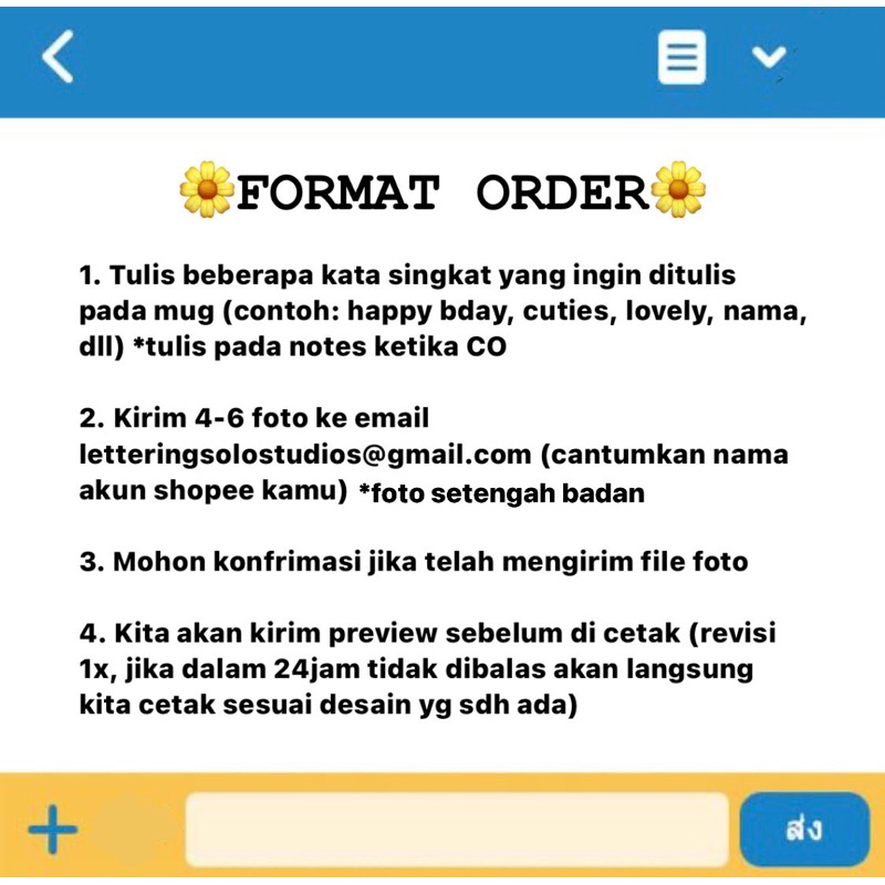 ✔️ KIRIM 4-6 FOTO PADA EMAIL letteringsolostudios@gmail.com (foto setengah badan) ✔️ TULISAN MUG: *beberapa kata singkat saja ✔️ TULISAN CARD: (jika memakai) *ditulis sendiri juga boleh ya ka 🫶