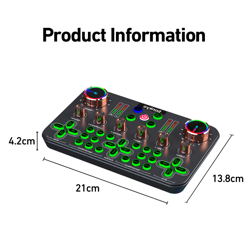 Deskripsi Produk: Sound card ini dirancang khusus untuk mereka yang ingin siaran langsung atau merasakan karaoke di rumah, sehingga Anda dapat merasakan efek studio musik di rumah. Sound card ini juga dilengkapi dengan banyak efek khusus yang dapat membuat suara asli Anda menjadi lebih menarik. Bisa juga digunakan sebagai equalizer untuk mengatur bass, treble dan reverb sesuai keinginan anda.