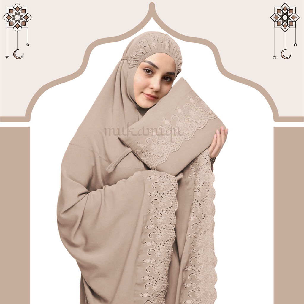 Mukena khadijah terbuat dari bahan katun Rosella jatuh dan tidak kusut, tidak menerawang, lembut, adem, berwarna pastel dan bordir yang cantik, dan tentu saja nyaman di pakai.