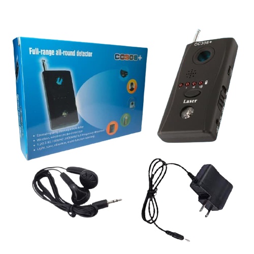 CC308 adalah wireless anti spy fill frequency detector. Device ini berfungsi untuk mendeteksi kamera, sinyal Bug GPS, VHF, GSM UFH, dll. Terdapat pin hole untuk melihat letak kamera, sinyal, dll.