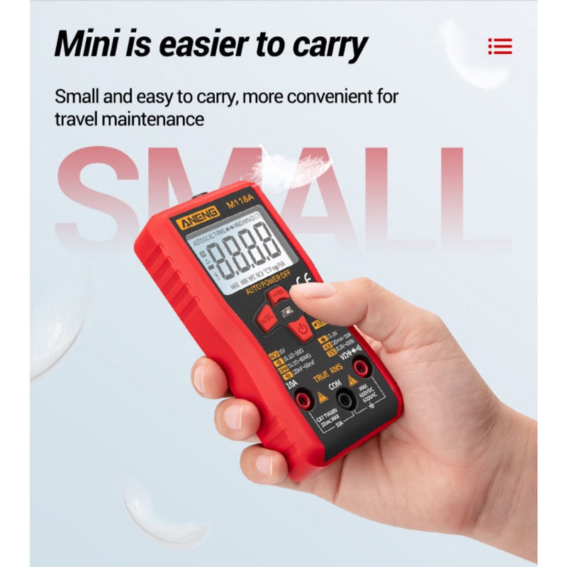 😀Fitur: Pertama di dunia 9999 menghitung multimeter digital seukuran telapak tangan Jangkauan otomatis / manual True RMS, chip yang dikalibrasi sendiri, akurasi tinggi Perlindungan kelebihan beban 550V ("μA" Mode dikecualikan) 17 mode uji Layar LCD besar dengan lampu latar putih Tahan data, matikan otomatis Ukur arus hingga 10A Kapasitansi Meaure hingga 10mF Fungsi output gelombang persegi Dua baterai AAA, lebih mudah diubah Lulus tes penurunan dua meter, bracket anti-fraktur