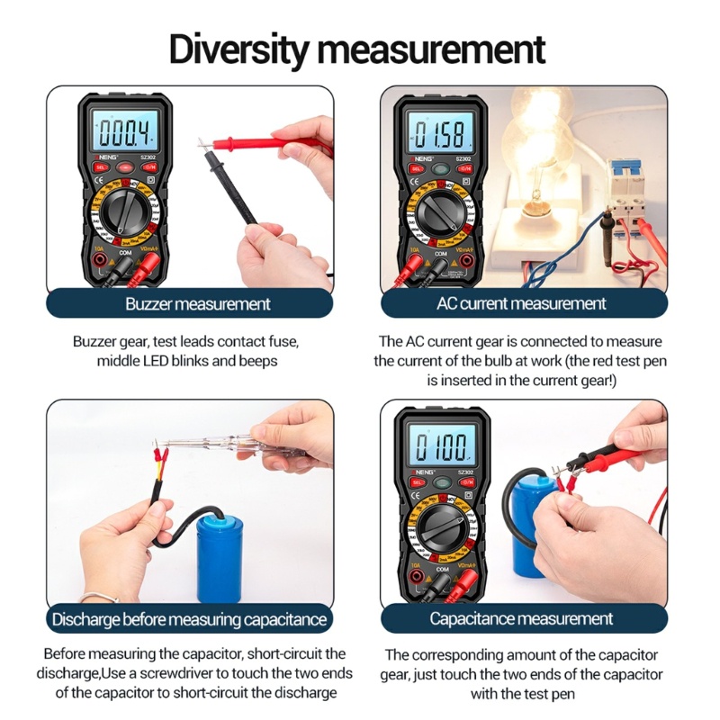 Portabel Auto-Ranging Multimeter Ohm Volt Meter Multi Penguji dengan Senter & Lampu Belakang Fungsi Anti-bakar & NCV Fitur: Pengukuran tegangan/arus/ohm/dioda/lanjutkan/kapasitansi yang akurat. Mendukung pemegangan data, layar latar LCD besar, mati otomatis & dudukan tendangan memudahkan proses pengukuran. Multimeter ini adalah mitra emas untuk membantu menyuntikkan berbagai masalah listrik otomotif dan rumah tangga dengan aman dan akurat. Kawat keramik ganda anti-bakar dan melindungi dari kelebihan beban, dan akan lebih aman dan andal. Sangat Berguna untuk laboratorium, pendidikan, pabrik, bengkel, direkomendasikan dari banyak insinyur profesional.
