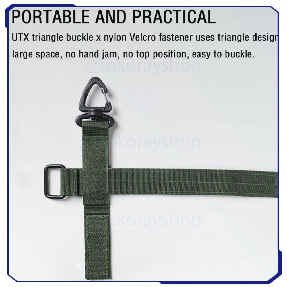 Carabiner velcro serbaguna ini terbuat dari bahan material nylon tebal sehingga dapat digunakan untuk menggantung berbagai benda berat. Buckle terbuat dari plastik sehingga tidak perlu cemas gantungan mudah putus. Alat ini juga dapat digantung pada tas dan menjepit sarung tangan, tali dan peralatan lainnya.