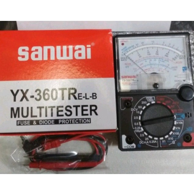 isi paket Multitester Manual /Analog Sanwai YX-360 1pcs x mulitester 2pcs x kabel + - 1pcs x baterai 9volt 2pcs x baterai aa Multi tester atau avometer yang dapat mengukur Amper Volt dan Ohm... Dan desain yang ramping cocok untuk kamu yang hoby service elektronik