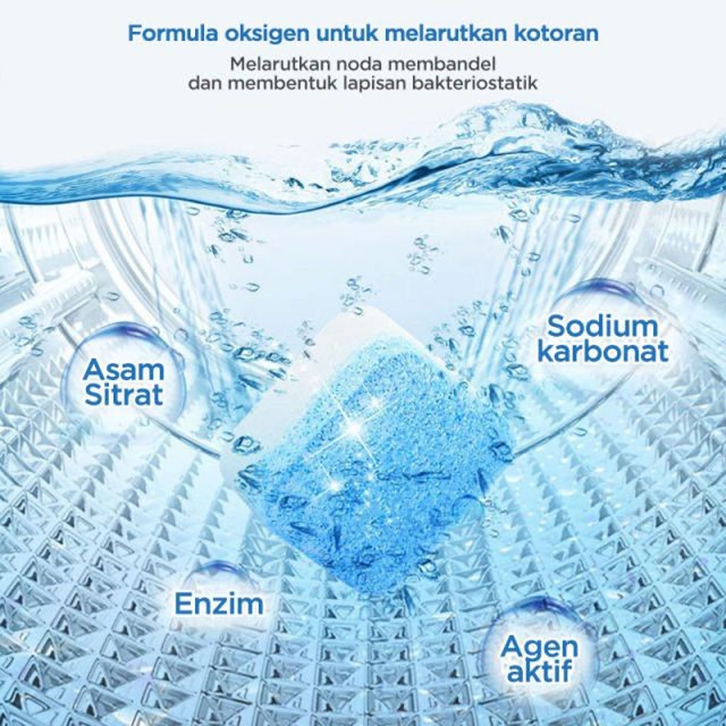 Cara Pemakaian : 1. Kosongkan mesin cuci. 2. Masukan tablet deep cleaning ke dalam mesin cuci. 3. Masukan sedikir air ke dalam mesin cuci. 4. Hidupkan mesin cuci. 5. Setelah selesai diamkan mesin cuci selama 4 s/d 8 jam.