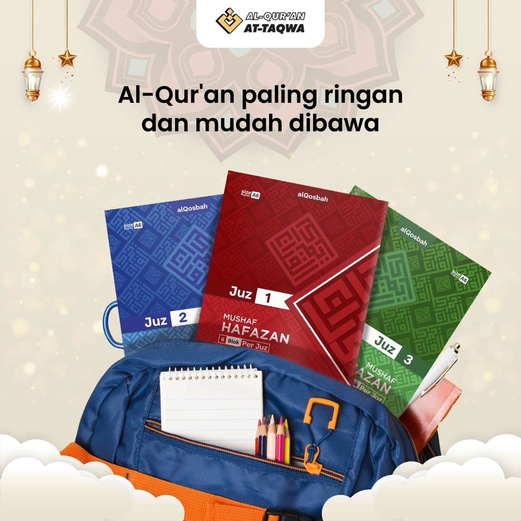 Keunggulan : 1. Mempunyai banyak varian warna disetiap juznya 2. Mempunyai fitur kusus untuk menghafal yaitu keyword awal ayat, kolom murojaah, dan 8 blok warna untuk membantu hafalan 3. Material bahan kertas HVS Premium yang berkualitas tinggi merupakan jenis kertas berwarna dengan tekstur tingkat kehalusan yang tinggi 4. Design soft cover yang elegan dan milenial 5. Praktis, karena ukurannya A6 sehingga pas disaku dan mudah untuk dibawa kemanapun 6. Cetakan teks yang jelas dan nyaman dimata pada saat melantunkan ayat-ayat suci Al-Quran 7. Mempunyai tas kecil/dompet yang tahan air sehingga alquran hafalan ini tidak mudah rusak dan basah