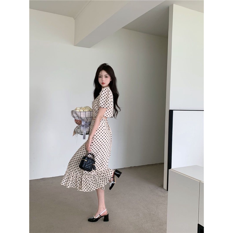 Detail Musim Panas Baru Polka Dot Puff Lengan Pinggang Tinggi Rok Dua Potong Set