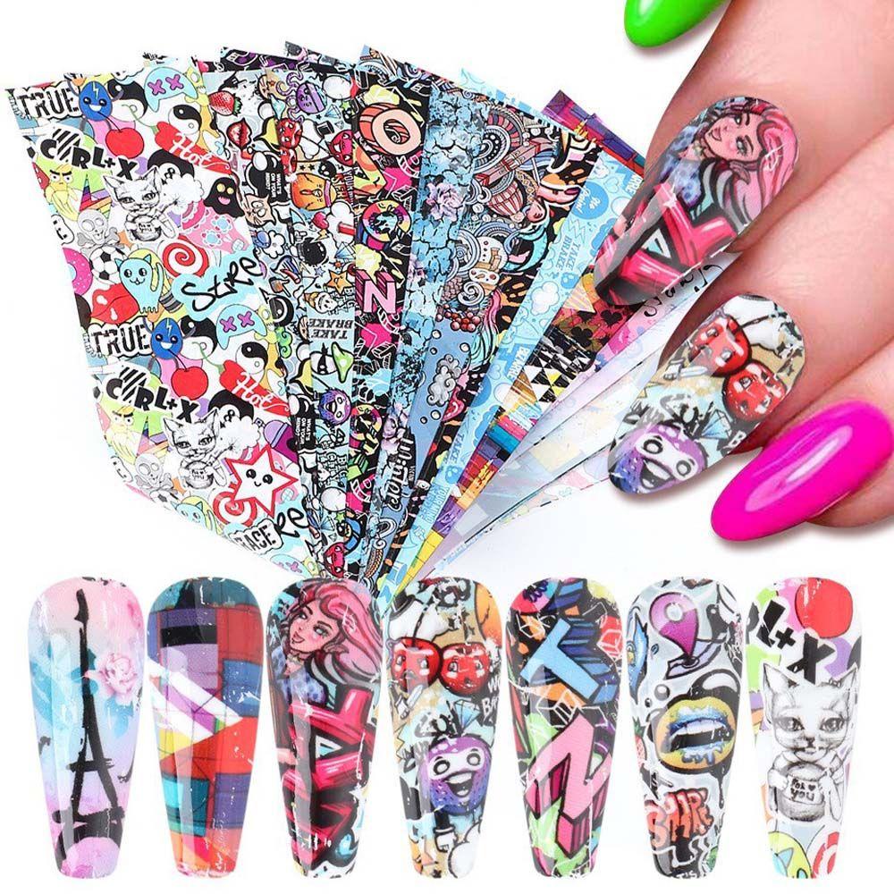Direkomendasikan untuk :Direkomendasikan untuk digunakan di atas gel top coat dan disegel dengan gel top coat dan disegel dengan gel top coat Gaya Koran Stiker Kuku Transfer Kuku Foils Holografik Stiker Kuku Stiker Kuku Set Nail Art Dekorasi Manicure Starry Sky Marbling Graffiti Pola Perekat Diri DIY Fashion 10pcs