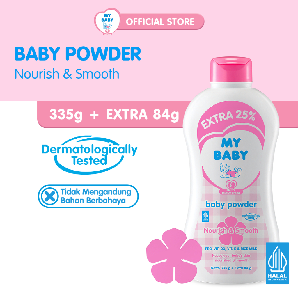 - My Baby Powder NOurish & Smooth merupakan rangkaian bedak bayi yang telah teruji klinis, dengan formula yang lembut, tekstur yang halus dan mudah merata, membantu menjaga kelembaban dan melindungi kulit bayi yang teramat halus. Kandungan Chamomile membantu mencegah iritasi ringan pada kulit bayi. Kandungan : Talc, Parfum (Fragrance), Chamomile Oil. Exp Date : Januari 2027 No BPOM : NA18140400012
