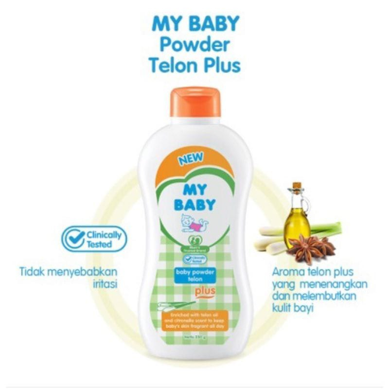 Kombinasi bedak dengan aroma telon & Citronella dalam MY BABY Powder Telon Plus. Bedak bayi yang telah teruji klinis sehingga aman digunakan pada kulit bayi. Aroma telonnya mampu menghangatkan kulit bayi, serta formulanya mampu menjaga kelembutan dan menenangkan kulit bayi.