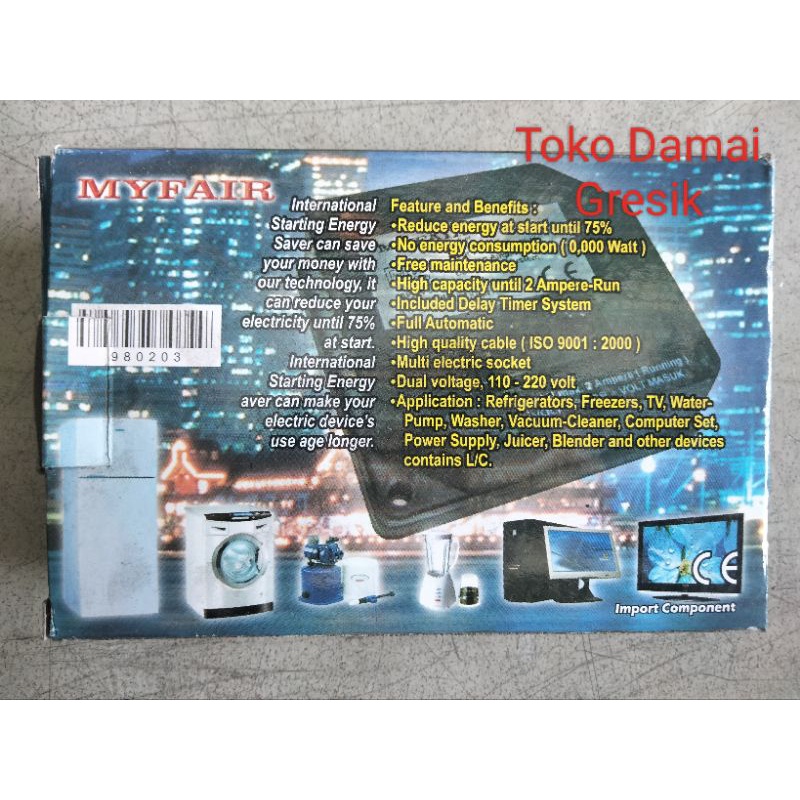 *Auto Start Inverator Atau Alat Biar listrik tidak mati pada tarikan pertama - Brand : My Fair * Fitur dan Manfaat : - Mengurangi Daya Tarikan Pertama hingga 75% - Daya Maksimal Sampai 2A - Voltage : 110v - 220v - Bisa digunakan untuk Kulkas, Freezers, TV, Pompa air , Mesin cuci , Vacuum-Cleaner, Komputer, Power Supply , Blender dan lain-lain