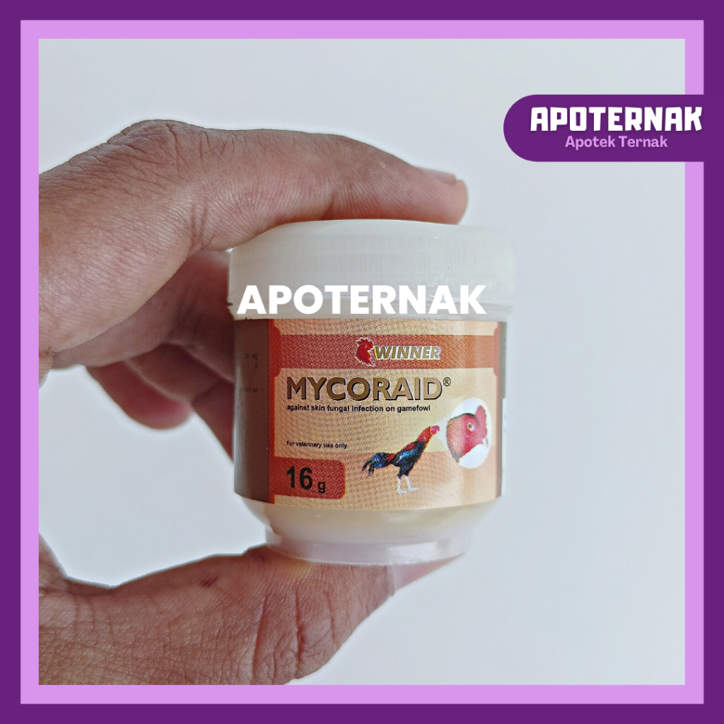 MYCORAID merupakan sediaan berbentuk salep mengandung miconazole nitrat yang berfungsi mengobati infeksi jamur pada kulit ayam. Mic.ona.zo.le bekerja dengan cara menghambat kerja enzim P-450 yang berperan dalam pembentukkan membran sel pada jamur. Senyawa ini juga berperan dalam menghambat penyerapan purin, merusak trigliserida dan biosintesis fosfolipid, dimana keseluruhan mekanisme ini berakibat pada kematian jamur. MYCORAID efektif mengobati penyakit kulit pada ayam akibat infeksi jamur seperti keropeng, koreb dan bercak putih.