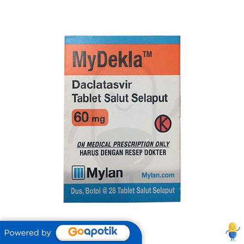 Deskripsi : PENGGUNAAN OBAT INI HARUS SESUAI PETUNJUK DOKTER. Merupakan obat yang digunakan untuk menangani hepatitis C. Penggunaan mydekla harus dikombinasikan dengan sofosbuvir. Selain digunakan bersama sofosbuvir, daclatasvir juga bisa dikombinasikan dengan obat antivirus lain, seperti ribavirin | Komposisi : Tiap tablet mengandung daclatasvir 60 mg | Dosis : ATURAN PAKAI HARUS SESUAI DENGAN PETUNJUK DOKTER. 1 x 60 mg sehari | Indikasi : Digunakan untuk menangani hepatitis C. Penggunaan dasvir harus dikombinasikan dengan sofosbuvir. Selain digunakan bersama sofosbuvir, daclatasvir juga bisa dikombinasikan dengan obat antivirus lain, seperti ribavirin | Perhatian Khusus : Harus dengan resep dokter. Jangan berhenti mengonsumsi daclatasvir walaupun kondisi Anda sudah membaik. | Kemasan : DUS, 1 BOTOL PLASTIK @ 28 TABLET SALUT SELAPUT | NIE : DKI1740400417B1