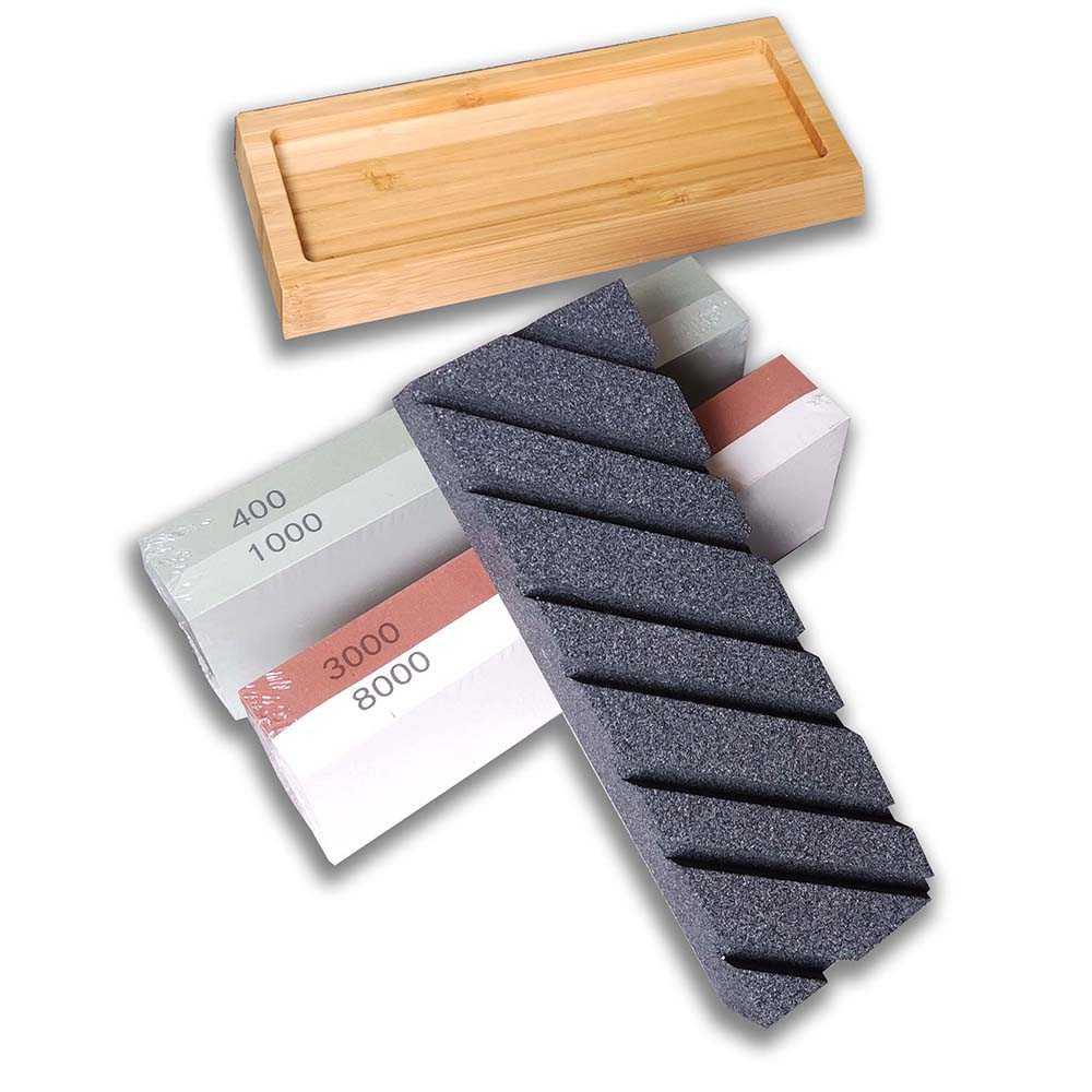 Set Batu Asahan Anda akan mendapat 3 buah batu pengasah yaitu pengasah 400/1000, 3000/8000, dan batu coarse yang biasa digunakan untuk meratakan batu pengasah sehabis digunakan untuk mengasah pisau. Kehadiran tiga jenis batu ini membuat perlengkapan mengasah Anda sama dengan para profesional di dunia pisau.