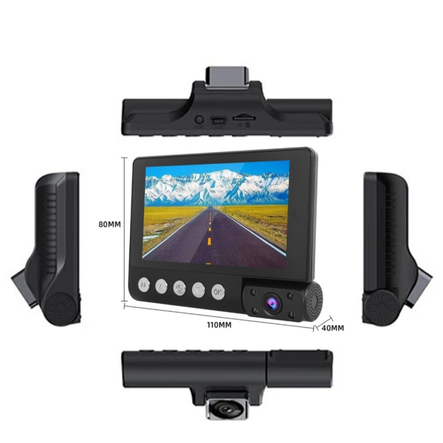 SPEKSIFIKASI : 4i nci Touch Screen Ukuran Layar : IPS 4.0in HD Sensor: GC 1064 Lensa : Depan GC1054 / Cabin 0308 / belakang OV09 Resolusi : Depan 1800P/30fps / Cabin 720P/25fps / Belakang 480P/25fps Sudut lebar lensa : Depan 170° / Cabin 120° / Belakang 120° Bukaan lensa utama : F2.0 Pixel : 3MP Format File : AVI Daya: 5V / 1A max 2A ( TIDAK SUPPORT FAST CHARGING ) Daya Mobil : 12V -24V Socket : Mini USB Night Vision : Support G-sensor : Support Fungsi anti-getaran : Support Daya : Adapter Socket Lighter Baterai daya : baterai lithium 150 mAh Slot Memory : Micro SD Max 64GB ( DISARANKAN MEMORY CLASS 10 / 100mbps ) Bahasa : Inggris, Cina Sederhana, Cina Tradisional, Prancis, Jerman, Thailand, Jepang, Spanyol, Portugis