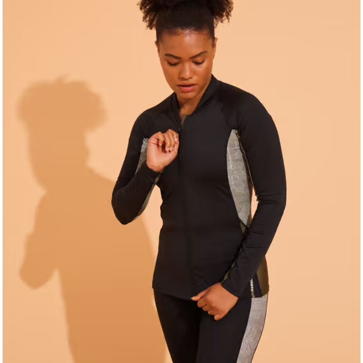NABAIJI Atasan Renang Lengan Panjang Beritsleting Aquafit Wanita ----------- Tim desain kami mengembangkan atasan renang beritsleting ini untuk wanita yang mengikuti kelas Aquafit atau Aquabiking. Ingin menutupi bagian atas tubuh Anda selama sesi Aquabiking? Gunakan jaket aquatic dengan ketahanan klorin dan ritsleting depan agar mudah dikenakan/dilepas. Kain utama: 28.0% Elastane, 72.0% Polyethylene Terephtalate (PET); Kerah: 18.0% Elastane, 82.0% Polyethylene Terephtalate (PET).