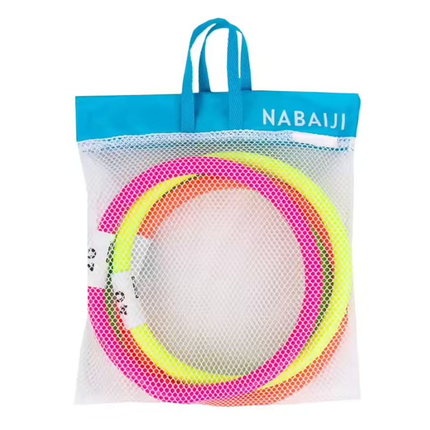 NABAIJI Ring Latihan Renang 4 Cincin Pemberat Multi Color ------------ Didesain agar anak merasa senang dan tenang di dalam air. Anak dapat melempar cincin-cincin ini yang akan tenggelam ke dasar kolam; lalu mereka harus mengambilnya di dalam air sambil belajar menahan napas. Pisau: 100.0% Polivinil klorida (PVC); Ruang dalam: 100.0% Pasir; Saku: 100.0% Polyethylene Terephtalate (PET).