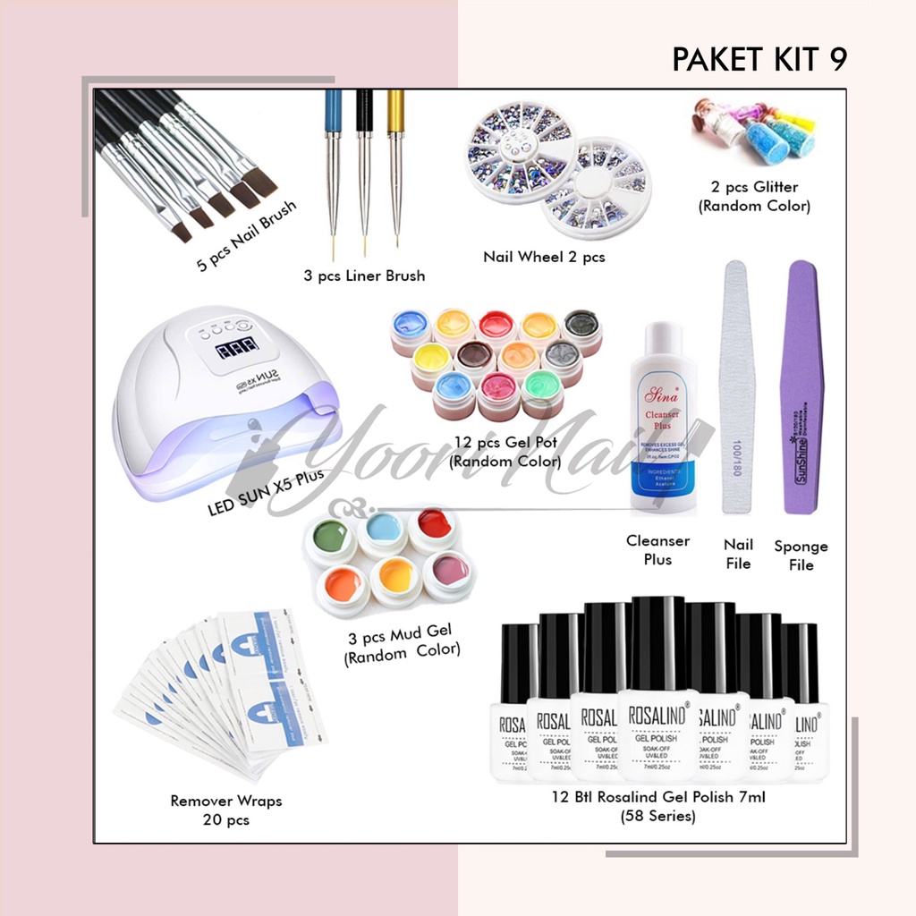 Paket Termasuk: 12 pcs Rosalind 58 Series 7ml (Gel color bisa pilih warna, ditulis di note) 12 pcs solid gel pot set 3 pcs cream mud gel 20 pcs remove wraps 1 pcs sponge file sunshine 1 pcs nail file 100/180 1 pcs cleanser plus 2 pcs glitter botol 2 pcs nail deco (RANDOM) 1 pcs liner brush set 5 pcs uv gel brush set 1 pcs LED SUN X5 PLUS 54w