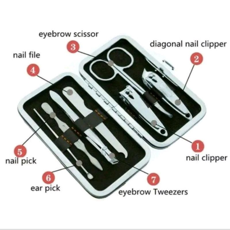 Manicure set adalah alat untuk membersihkan kuku baik tangan maupun kaki. Manicure Set ini lumayan lengkap yaitu ada 7 buah alat dengan fungsi yang berbeda-beda. . 1. 1pc Gunting Kuku Standar (Biasa) 2. 1pc Gunting Kuku Lancip 3. 1pc Pinset 4. 1pc Pengasah Kuku 5. 1pc Korek Kuping 6. 1pc Gunting Lancip 7. 1pc Pendorong Kutikula