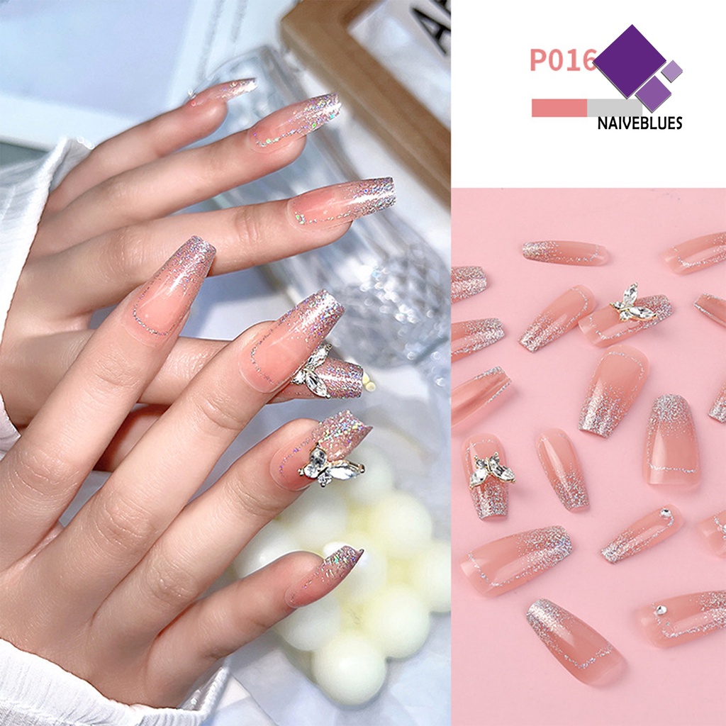 Detail [naiveblues] 24pcs Kuku Palsu Dengan Lem Gaya Perancis Mudah Dipakai DIY Nail Full Cover
