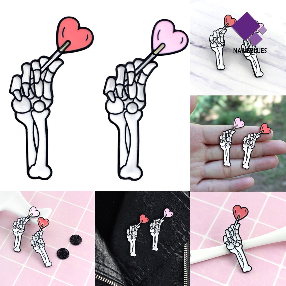 Detail < Naiveblues > Skeleton Hand Bros Pin Kerah Denim Enamel Love Heart Halloween