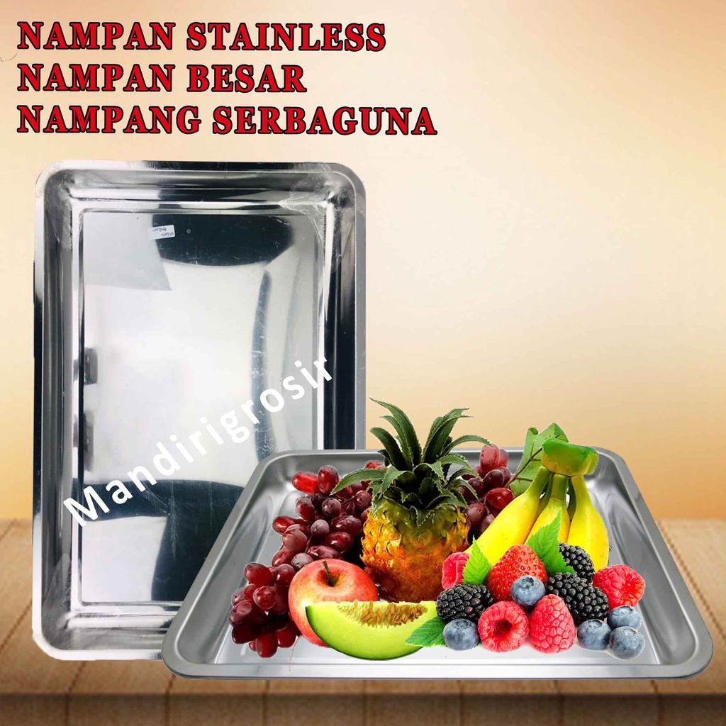 Nampan Stainless/ Nampan Besar/ Nampan Serbaguna Nampan Stainless sangat di rekomendasikan untuk perlengkapan rumah/ dapur, nampan ini biasa digunakan di tempat rumah makan untuk tempat sayur dan lauk, dengan bahan stainless steel anti karat.