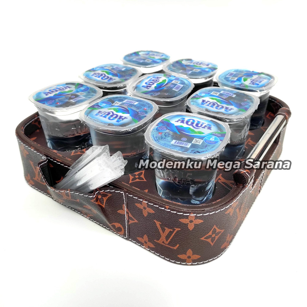Bahan Plywood lapis Vinyl kulit sintetis Handle pipa stainless steel Ukuran PxLxT 27x26x6 cm Berat 700 gram Isi 9 lubang tempat Aqua gelas Ada tempat sedotan Bisa sebagai nampan gelas maupun tatakan Aqua Gelas