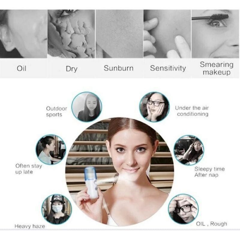 lelah karena banyaknya aktivitas/kerjaan? kulit wajah memerah dan terbakar karena panasnya sinar UV matahari? atau wajah sensitif tapi pengen sesuatu yang melembabkan?hmm...gak perlu khawatir dong! karena sekarang sudah hadir Mini Nano Mist Spray Perawatan Wajah-Portable USB yang mempunyai banyaak fungsi dan pastinya cocok banget buat keseharian kamu